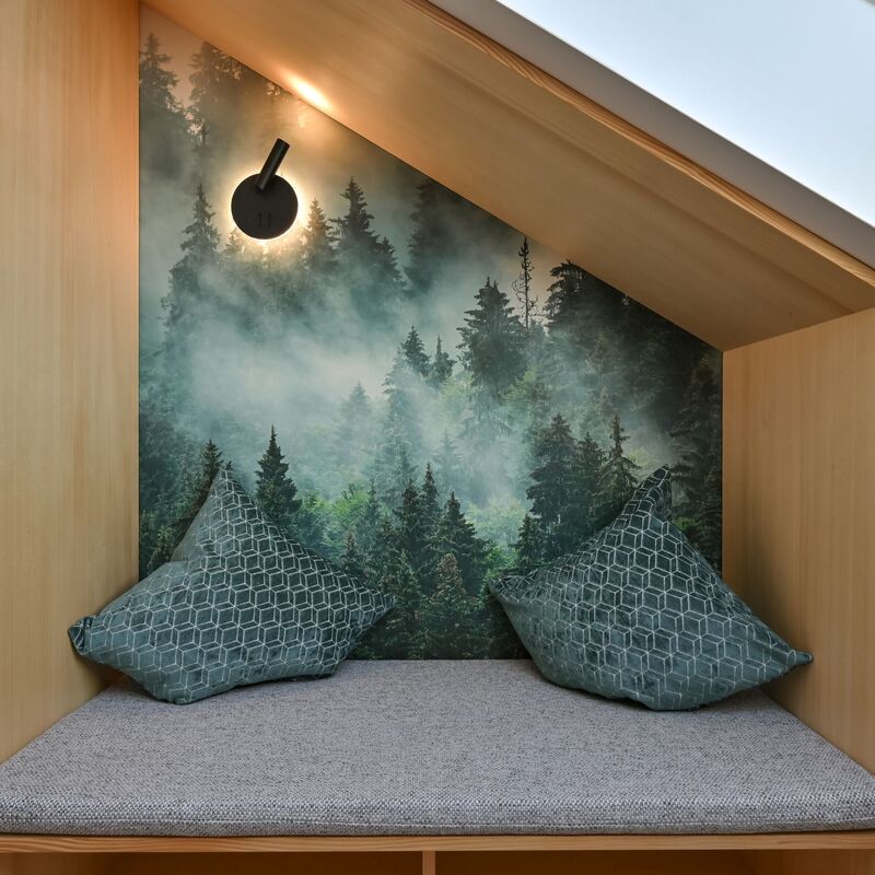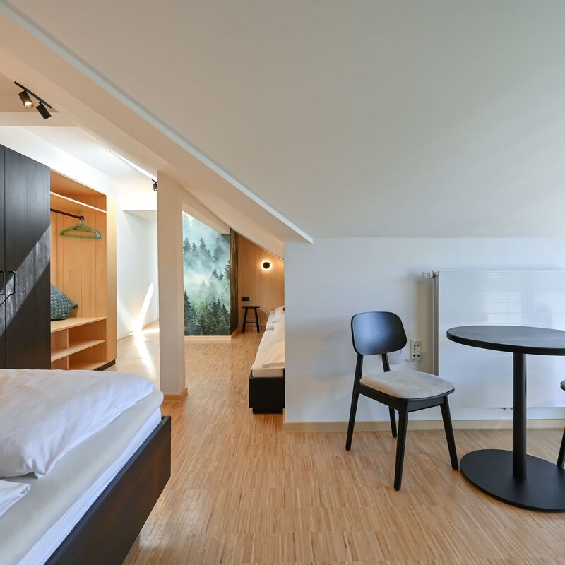 Unsere modern gestalteten Comfortzimmer und Comfortappartements unterm Dach verbinden Gemütlichkeit mit Komfort. Die frisch renovierten Räumlichkeiten (Dezember 2024) bieten Familien viel Platz und eine warme Atmosphäre. Ob Familienzimmer mit Doppelbett, zwei Einzelbetten und Balkon oder Appartement mit Elternschlafzimmer, separatem Kinderzimmer und Balkonzugang – beide Kategorien verfügen über ein großzügiges Familienbad (Dusche/WC). Die Kombination aus Naturholz und stilvollen Waldtapeten sorgt für ein modernes und behagliches Ambiente mit traumhaftem Bergblick.