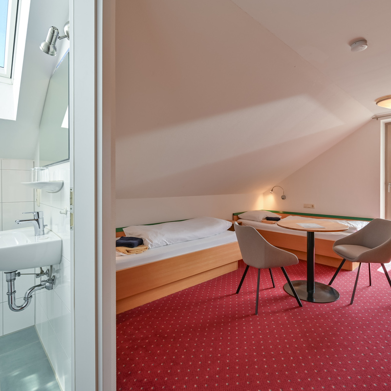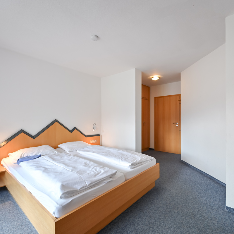 Unsere geräumigen Doppelzimmer haben ein Doppelbett und genügend Platz für ein Zustellbett für Kleinkinder, teilweise auch für ein zusätzliches Bett, sodass sie in ein Dreibettzimmer umfunktioniert werden können. Brauchen Sie dies nicht, können Sie den Raum privat für sich genießen.