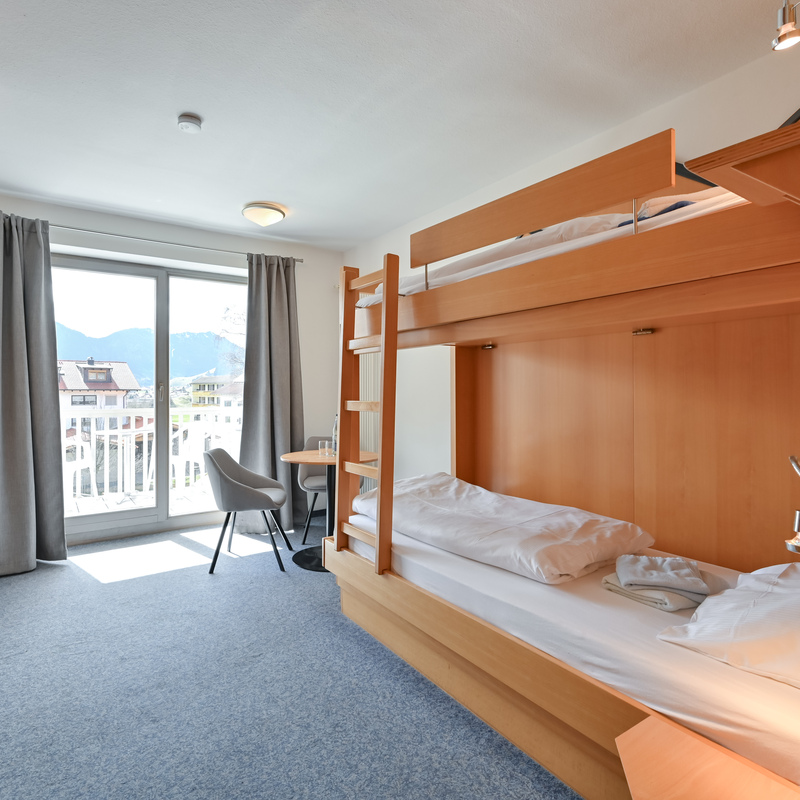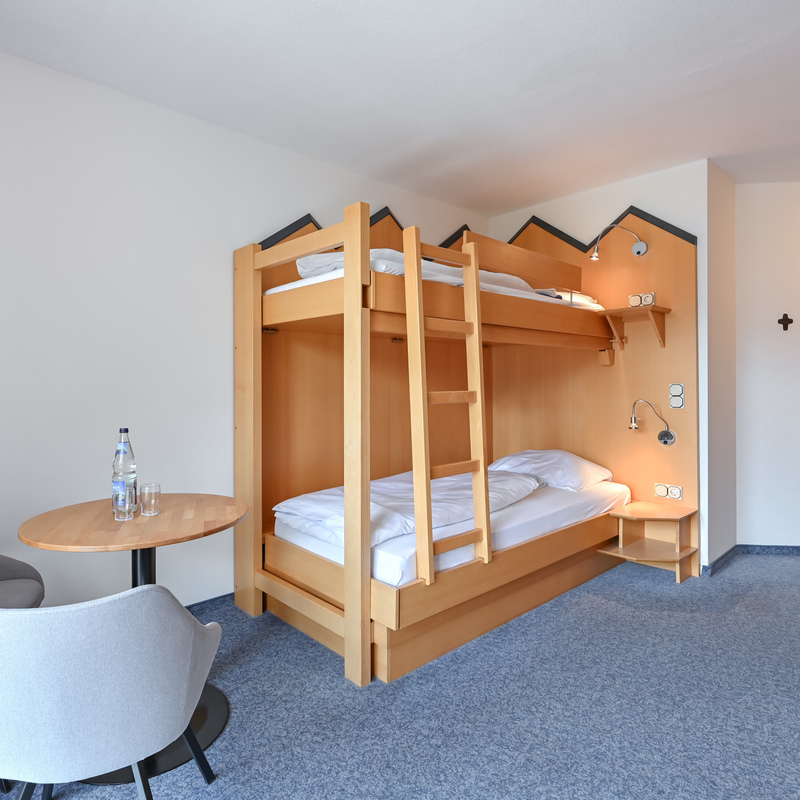 Unsere Einzelzimmer sind großzügig geschnitten und teilweise mit einem zusätzlichen Sofa ausgestattet. Es handelt sich um Etagenbetten, bei denen das obere Bett bei Buchung als Einzelzimmer weggeklappt wird, um persönlichen Freiraum zu erreichen.